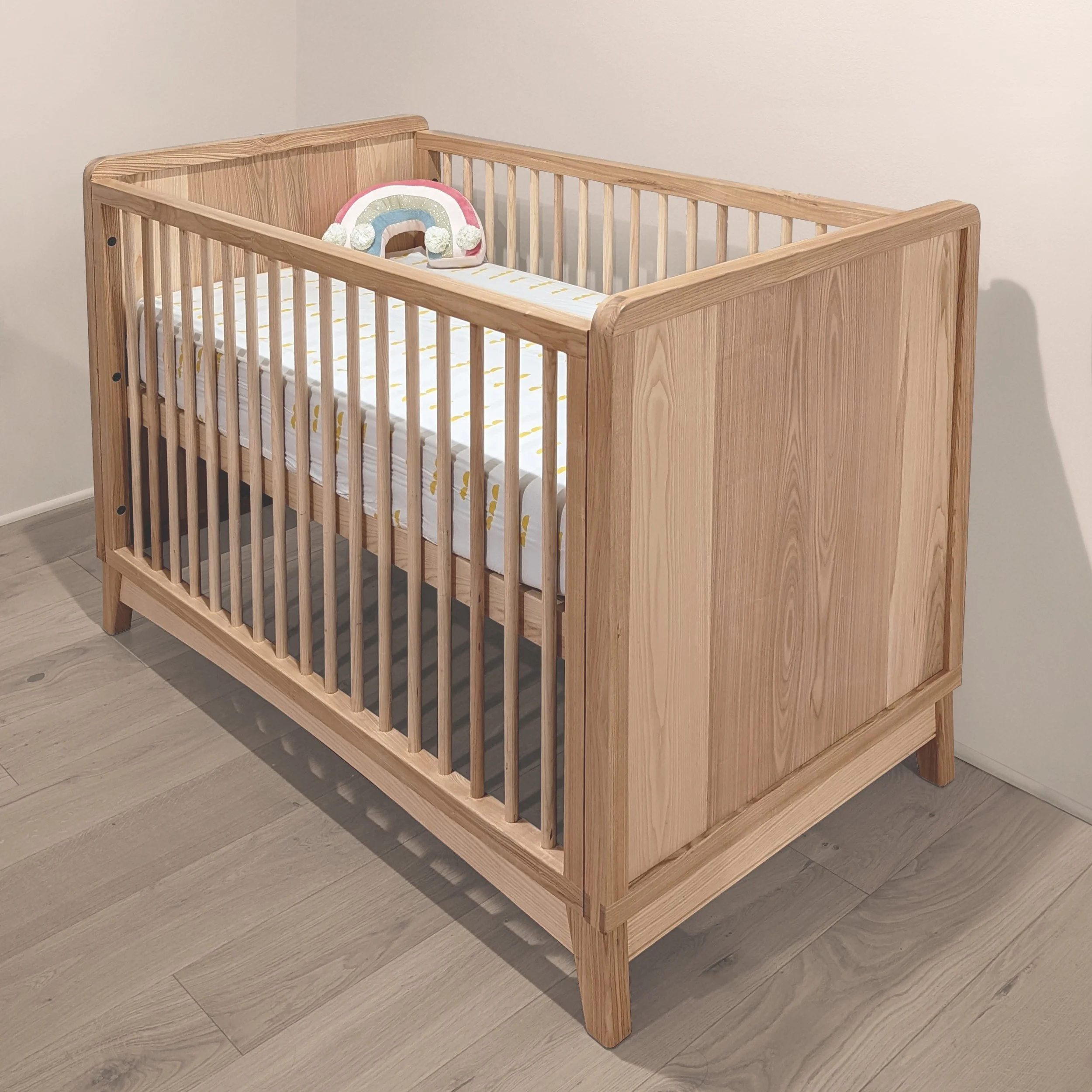 Part of the Siena bedroom collection, this crib features knock-down construction, an adjustable bed height, and bridle-jointed corners. The contrasting sapwood-heartwood grain gives it character and the solid 100% hardwood construction will give you peace of mind knowing that your crib will keep your baby safe. The design of the crib is in accordance with standards set by the United States Consumer Product Safety Commission.